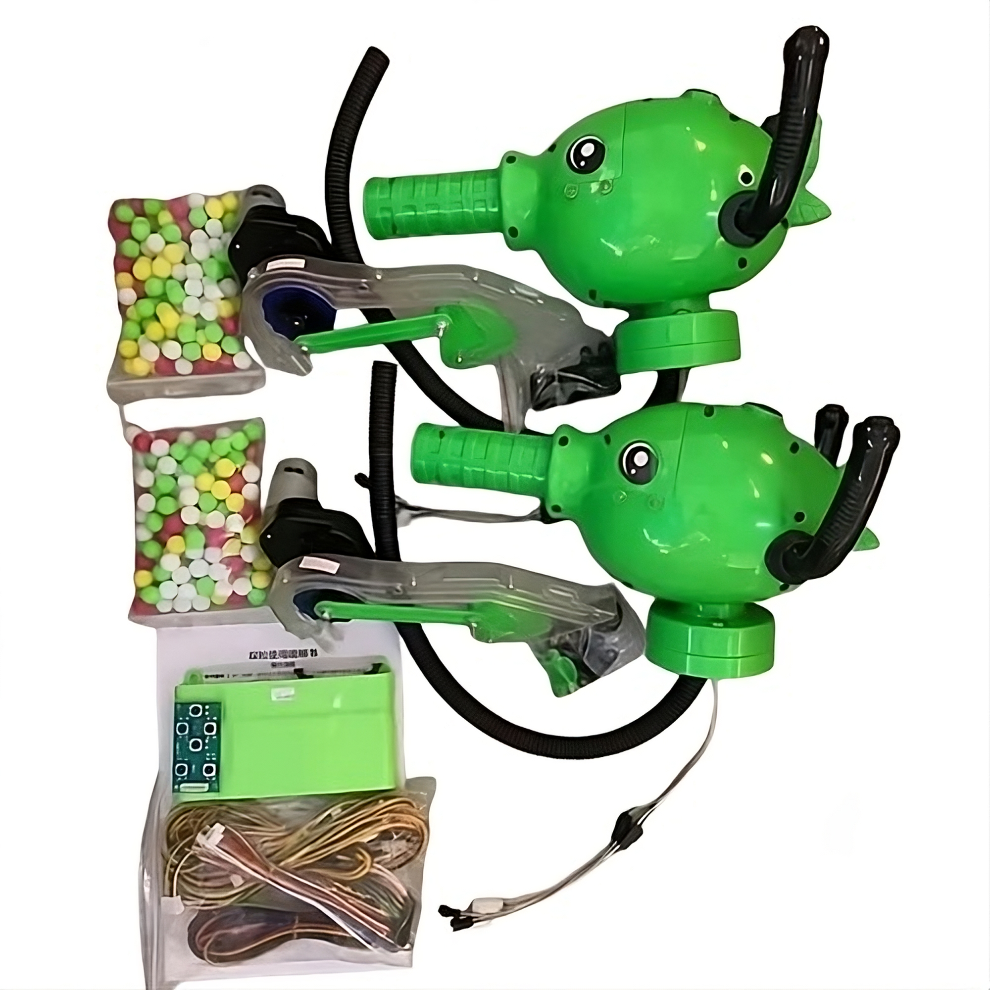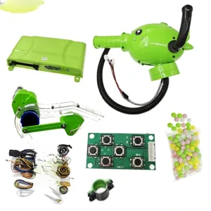 Enhance your amusement machines with this complete Ball Shooting Kit, built for interactive arcade experiences. The set includes two green elephant-shaped shooting guns with attached air tubes for smooth ball propulsion, a set of multicolor soft foam balls, a wiring harness, a control board, and a user manual for easy setup.